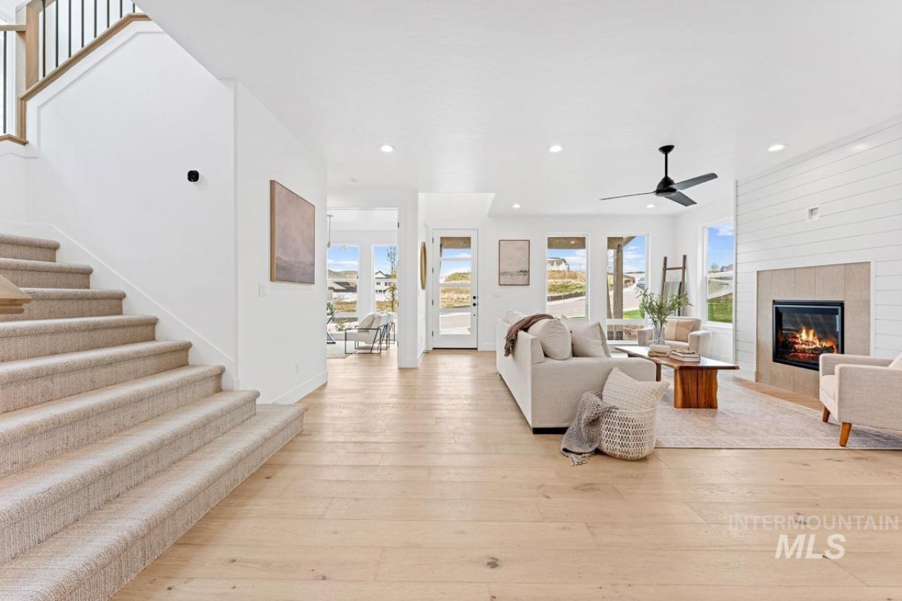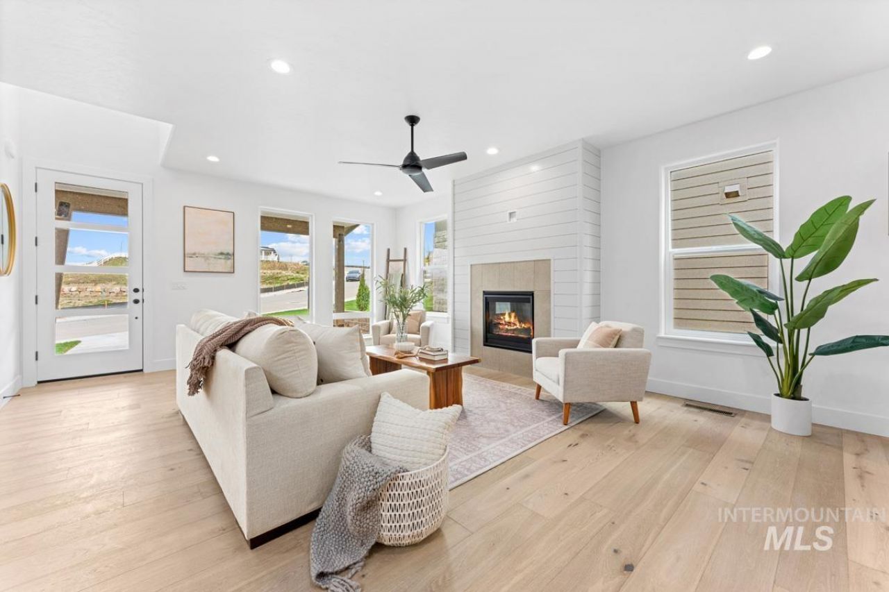 Enjoy exclusive lock and leave living at one of the most affordable price points in Dry Creek Ranch. This low maintenance home INCLUDES LANDSCAPE MAINTENANCE and is conveniently located near the 5-acre community center which has a pool, gym, clubhouse, and sport courts. Embark on adventure with hiking/biking trails minutes from your doorstep or take a swing at one of the nearby golf courses. Downtown Eagles shops and restaurants are waiting to be explored just a quick drive away. This two-story Palouse home welcomes you into a dramatic great room with an open-to-below layout, soaring ceilings, a platform fireplace, and a covered patio. Just off the main living space, the chefs kitchen features a spacious island, handsome cabinetry, and an oversized pantry with appliance shelving. A dedicated main-floor office adds quiet, flexible space for work or study. Upstairs, a generous loft offers additional living space alongside several large bedrooms. The primary suite is tucked away featuring wall-to-wall windows, a luxurious bath, and dual walk-in closets. The 3-car garage offers plenty of space to store your vehicles and toys. Peaceful low maintenance living means you can explore the best of what Idaho has to offer. Proximity to highway 55 allows for short day trips or longer vacations to hot springs, ski resorts, lakes, mountains, and more.
